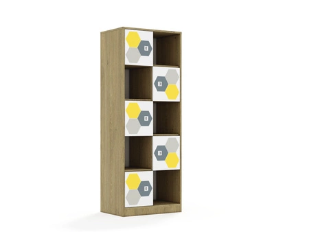 Kolekcja mebli szkolnych Hex to funkcjonalne i estetyczne rozwiązanie, idealne do każdej przestrzeni edukacyjnej. Fronty szafek i szuflad są w kolorze białym, ozdobione drukowanymi motywami połączonych sześciokątów, które dodają meblom nowoczesnego i dynamicznego wyglądu. Nadruki są dostępne w kolorach zielonych, czerwonych, niebiesko-fioletowych oraz szaro-żółtych, co pozwala na tworzenie interesujących i kolorowych aranżacji w przestrzeni szkolnej. Korpus posiadający uniwersalne owiercenia umożliwiające zamontowanie półek na różnych wysokościach. Cokół w kolorze korpusu chroniący dolne krawędzie mebla przed uszkodzeniami i zabrudzeniami. Półki w kolorze korpusu wykonane z płyty melaminowanej o grubości 18 mm. Mocowanie półek za pomocą złącz RAFIX firmy Hafele. Montaż polegający na wsunięciu półki z góry w dół, podobnie jak przy tradycyjnych podpórkach. Wbudowany mechanizm mimośrodu dociągający półkę, zapewniający wysoką stabilność mebla. Stopki regulujące umożliwiające wypoziomowanie mebla. Stopki antypoślizgowe zabezpieczające podłogę przed zarysowaniem. Ściany tylne mebla wykonane z białej płyty HDF o grubości 3mm. Wpuszczane w nutę wykonaną w bokach oraz wieńcu górnym co nadaje stabilności meblom oraz sprawia, że wszelkie połączenia płyty hdf z meblem są niewidoczne. Dodatkowo HDF usztywniony jest punktowymi, również niewidocznymi plastikowymi stabilizatorami wkręconymi i wciśniętymi między płytę a nutę. Przegroda w kolorze korpusu wykonana z płyty melaminowanej o grubości 18 mm.