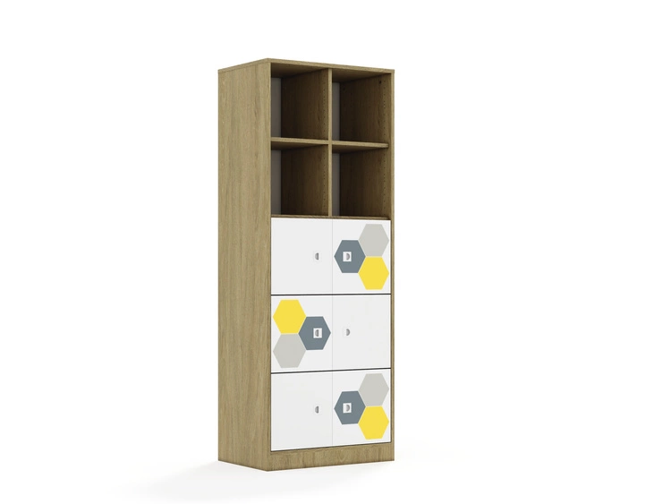 Kolekcja mebli szkolnych Hex to funkcjonalne i estetyczne rozwiązanie, idealne do każdej przestrzeni edukacyjnej. Fronty szafek i szuflad są w kolorze białym, ozdobione drukowanymi motywami połączonych sześciokątów, które dodają meblom nowoczesnego i dynamicznego wyglądu. Nadruki są dostępne w kolorach zielonych, czerwonych, niebiesko-fioletowych oraz szaro-żółtych, co pozwala na tworzenie interesujących i kolorowych aranżacji w przestrzeni szkolnej. Korpus posiadający uniwersalne owiercenia umożliwiające zamontowanie półek na różnych wysokościach. Cokół w kolorze korpusu chroniący dolne krawędzie mebla przed uszkodzeniami i zabrudzeniami. Półki w kolorze korpusu wykonane z płyty melaminowanej o grubości 18 mm. Mocowanie półek za pomocą złącz RAFIX firmy Hafele. Montaż polegający na wsunięciu półki z góry w dół, podobnie jak przy tradycyjnych podpórkach. Wbudowany mechanizm mimośrodu dociągający półkę, zapewniający wysoką stabilność mebla. Stopki regulujące umożliwiające wypoziomowanie mebla. Stopki antypoślizgowe zabezpieczające podłogę przed zarysowaniem. Ściany tylne mebla wykonane z białej płyty HDF o grubości 3mm. Wpuszczane w nutę wykonaną w bokach oraz wieńcu górnym co nadaje stabilności meblom oraz sprawia, że wszelkie połączenia płyty hdf z meblem są niewidoczne. Dodatkowo HDF usztywniony jest punktowymi, również niewidocznymi plastikowymi stabilizatorami wkręconymi i wciśniętymi między płytę a nutę. Przegroda w kolorze korpusu wykonana z płyty melaminowanej o grubości 18 mm.