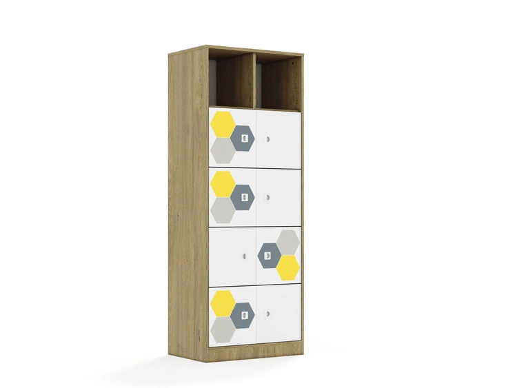 Kolekcja mebli szkolnych Hex to funkcjonalne i estetyczne rozwiązanie, idealne do każdej przestrzeni edukacyjnej. Fronty szafek i szuflad są w kolorze białym, ozdobione drukowanymi motywami połączonych sześciokątów, które dodają meblom nowoczesnego i dynamicznego wyglądu. Nadruki są dostępne w kolorach zielonych, czerwonych, niebiesko-fioletowych oraz szaro-żółtych, co pozwala na tworzenie interesujących i kolorowych aranżacji w przestrzeni szkolnej. Korpus posiadający uniwersalne owiercenia umożliwiające zamontowanie półek na różnych wysokościach. Cokół w kolorze korpusu chroniący dolne krawędzie mebla przed uszkodzeniami i zabrudzeniami. Półki w kolorze korpusu wykonane z płyty melaminowanej o grubości 18 mm. Mocowanie półek za pomocą złącz RAFIX firmy Hafele. Montaż polegający na wsunięciu półki z góry w dół, podobnie jak przy tradycyjnych podpórkach. Wbudowany mechanizm mimośrodu dociągający półkę, zapewniający wysoką stabilność mebla. Stopki regulujące umożliwiające wypoziomowanie mebla. Stopki antypoślizgowe zabezpieczające podłogę przed zarysowaniem. Ściany tylne mebla wykonane z białej płyty HDF o grubości 3mm. Wpuszczane w nutę wykonaną w bokach oraz wieńcu górnym co nadaje stabilności meblom oraz sprawia, że wszelkie połączenia płyty hdf z meblem są niewidoczne. Dodatkowo HDF usztywniony jest punktowymi, również niewidocznymi plastikowymi stabilizatorami wkręconymi i wciśniętymi między płytę a nutę. Przegroda w kolorze korpusu wykonana z płyty melaminowanej o grubości 18 mm.