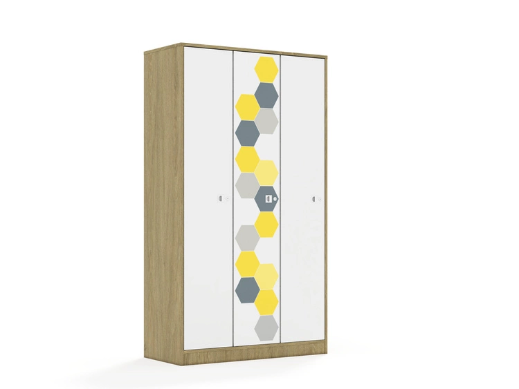 Kolekcja mebli szkolnych Hex to funkcjonalne i estetyczne rozwiązanie, idealne do każdej przestrzeni edukacyjnej. Fronty szafek i szuflad są w kolorze białym, ozdobione drukowanymi motywami połączonych sześciokątów, które dodają meblom nowoczesnego i dynamicznego wyglądu. Nadruki są dostępne w kolorach zielonych, czerwonych, niebiesko-fioletowych oraz szaro-żółtych, co pozwala na tworzenie interesujących i kolorowych aranżacji w przestrzeni szkolnej. Korpus posiadający uniwersalne owiercenia umożliwiające zamontowanie półek na różnych wysokościach. Cokół w kolorze korpusu chroniący dolne krawędzie mebla przed uszkodzeniami i zabrudzeniami. Półki w kolorze korpusu wykonane z płyty melaminowanej o grubości 18 mm. Mocowanie półek za pomocą złącz RAFIX firmy Hafele. Montaż polegający na wsunięciu półki z góry w dół, podobnie jak przy tradycyjnych podpórkach. Wbudowany mechanizm mimośrodu dociągający półkę, zapewniający wysoką stabilność mebla. Stopki regulujące umożliwiające wypoziomowanie mebla. Stopki antypoślizgowe zabezpieczające podłogę przed zarysowaniem. Ściany tylne mebla wykonane z białej płyty HDF o grubości 3mm. Wpuszczane w nutę wykonaną w bokach oraz wieńcu górnym co nadaje stabilności meblom oraz sprawia, że wszelkie połączenia płyty hdf z meblem są niewidoczne. Dodatkowo HDF usztywniony jest punktowymi, również niewidocznymi plastikowymi stabilizatorami wkręconymi i wciśniętymi między płytę a nutę. Przegroda w kolorze korpusu wykonana z płyty melaminowanej o grubości 18 mm.