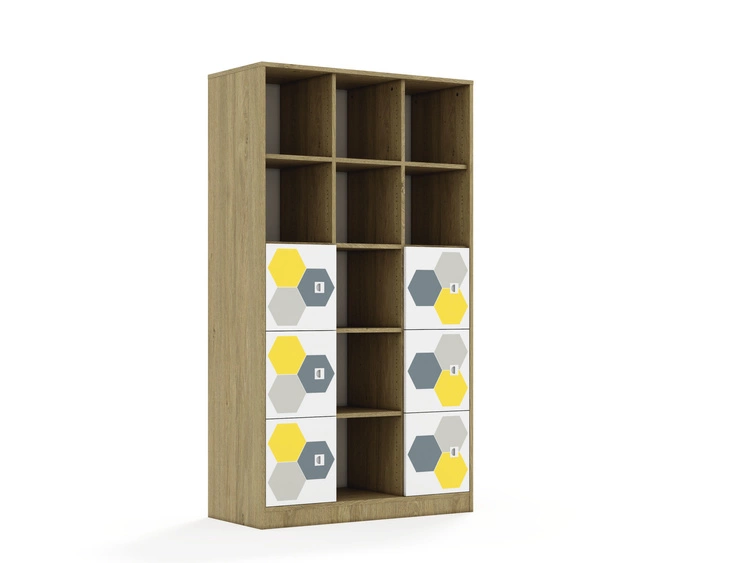 Kolekcja mebli szkolnych Hex to funkcjonalne i estetyczne rozwiązanie, idealne do każdej przestrzeni edukacyjnej. Fronty szafek i szuflad są w kolorze białym, ozdobione drukowanymi motywami połączonych sześciokątów, które dodają meblom nowoczesnego i dynamicznego wyglądu. Nadruki są dostępne w kolorach zielonych, czerwonych, niebiesko-fioletowych oraz szaro-żółtych, co pozwala na tworzenie interesujących i kolorowych aranżacji w przestrzeni szkolnej. Korpus posiadający uniwersalne owiercenia umożliwiające zamontowanie półek na różnych wysokościach. Cokół w kolorze korpusu chroniący dolne krawędzie mebla przed uszkodzeniami i zabrudzeniami. Półki w kolorze korpusu wykonane z płyty melaminowanej o grubości 18 mm. Mocowanie półek za pomocą złącz RAFIX firmy Hafele. Montaż polegający na wsunięciu półki z góry w dół, podobnie jak przy tradycyjnych podpórkach. Wbudowany mechanizm mimośrodu dociągający półkę, zapewniający wysoką stabilność mebla. Stopki regulujące umożliwiające wypoziomowanie mebla. Stopki antypoślizgowe zabezpieczające podłogę przed zarysowaniem. Ściany tylne mebla wykonane z białej płyty HDF o grubości 3mm. Wpuszczane w nutę wykonaną w bokach oraz wieńcu górnym co nadaje stabilności meblom oraz sprawia, że wszelkie połączenia płyty hdf z meblem są niewidoczne. Dodatkowo HDF usztywniony jest punktowymi, również niewidocznymi plastikowymi stabilizatorami wkręconymi i wciśniętymi między płytę a nutę. Przegroda w kolorze korpusu wykonana z płyty melaminowanej o grubości 18 mm.
