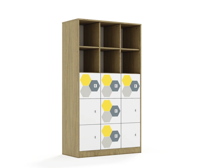 Kolekcja mebli szkolnych Hex to funkcjonalne i estetyczne rozwiązanie, idealne do każdej przestrzeni edukacyjnej. Fronty szafek i szuflad są w kolorze białym, ozdobione drukowanymi motywami połączonych sześciokątów, które dodają meblom nowoczesnego i dynamicznego wyglądu. Nadruki są dostępne w kolorach zielonych, czerwonych, niebiesko-fioletowych oraz szaro-żółtych, co pozwala na tworzenie interesujących i kolorowych aranżacji w przestrzeni szkolnej. Korpus posiadający uniwersalne owiercenia umożliwiające zamontowanie półek na różnych wysokościach. Cokół w kolorze korpusu chroniący dolne krawędzie mebla przed uszkodzeniami i zabrudzeniami. Półki w kolorze korpusu wykonane z płyty melaminowanej o grubości 18 mm. Mocowanie półek za pomocą złącz RAFIX firmy Hafele. Montaż polegający na wsunięciu półki z góry w dół, podobnie jak przy tradycyjnych podpórkach. Wbudowany mechanizm mimośrodu dociągający półkę, zapewniający wysoką stabilność mebla. Stopki regulujące umożliwiające wypoziomowanie mebla. Stopki antypoślizgowe zabezpieczające podłogę przed zarysowaniem. Ściany tylne mebla wykonane z białej płyty HDF o grubości 3mm. Wpuszczane w nutę wykonaną w bokach oraz wieńcu górnym co nadaje stabilności meblom oraz sprawia, że wszelkie połączenia płyty hdf z meblem są niewidoczne. Dodatkowo HDF usztywniony jest punktowymi, również niewidocznymi plastikowymi stabilizatorami wkręconymi i wciśniętymi między płytę a nutę. Przegroda w kolorze korpusu wykonana z płyty melaminowanej o grubości 18 mm.