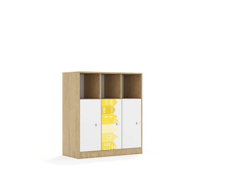 Kolekcja mebli przedszkolnych Houses to wyjątkowe rozwiązanie, które łączy funkcjonalność z estetyką, idealne dla przestrzeni edukacyjnych dla najmłodszych. Fronty szafek i szuflad są w kolorze białym, ozdobione drukowanymi motywami domków, które wprowadzają ciepły i przyjazny nastrój. Nadruki dostępne są w kolorach fioletowym, niebieskim, żółtym i pomarańczowym, dodając wnętrzom żywych i radosnych akcentów. Korpus posiadający uniwersalne owiercenia umożliwiające zamontowanie półek na różnych wysokościach. Cokół w kolorze korpusu chroniący dolne krawędzie mebla przed uszkodzeniami i zabrudzeniami. Półki w kolorze korpusu wykonane z płyty melaminowanej o grubości 18 mm. Mocowanie półek za pomocą złącz RAFIX firmy Hafele. Montaż polegajacy na wsunięciu półki z góry w dół, podobnie jak przy tradycyjnych podpórkach. Wbudowany mechanizm mimośrodu dociągający półkę, zapewniający wysoką stabilność mebla. Stopki regulujące umożliwiające wypoziomowanie mebla. Stopki antypoślizgowe zabezpieczające podłogę przed zarysowaniem. Ściany tylne mebla wykonane z białej płyty HDF o grubości 3mm. Wpuszczane w nutę wykonaną w bokach oraz wieńcu górnym co nadaje stabilności meblom oraz sprawia, że wszelkie połączenia płyty hdf z meblem są niewidoczne. Dodatkowo HDF usztywniony jest punktowymi, również niewidocznymi plastikowymi stabilizatorami wkręconymi i wciśniętymi między płytę a nutę. Przegroda w kolorze korpusu wykonana z płyty melaminowanej o grubości 18 mm.