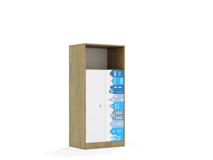 Kolekcja mebli przedszkolnych Houses to wyjątkowe rozwiązanie, które łączy funkcjonalność z estetyką, idealne dla przestrzeni edukacyjnych dla najmłodszych. Fronty szafek i szuflad są w kolorze białym, ozdobione drukowanymi motywami domków, które wprowadzają ciepły i przyjazny nastrój. Nadruki dostępne są w kolorach fioletowym, niebieskim, żółtym i pomarańczowym, dodając wnętrzom żywych i radosnych akcentów. Korpus posiadający uniwersalne owiercenia umożliwiające zamontowanie półek na różnych wysokościach. Cokół w kolorze korpusu chroniący dolne krawędzie mebla przed uszkodzeniami i zabrudzeniami. Półki w kolorze korpusu wykonane z płyty melaminowanej o grubości 18 mm. Mocowanie półek za pomocą złącz RAFIX firmy Hafele. Montaż polegajacy na wsunięciu półki z góry w dół, podobnie jak przy tradycyjnych podpórkach. Wbudowany mechanizm mimośrodu dociągający półkę, zapewniający wysoką stabilność mebla. Stopki regulujące umożliwiające wypoziomowanie mebla. Stopki antypoślizgowe zabezpieczające podłogę przed zarysowaniem. Ściany tylne mebla wykonane z białej płyty HDF o grubości 3mm. Wpuszczane w nutę wykonaną w bokach oraz wieńcu górnym co nadaje stabilności meblom oraz sprawia, że wszelkie połączenia płyty hdf z meblem są niewidoczne. Dodatkowo HDF usztywniony jest punktowymi, również niewidocznymi plastikowymi stabilizatorami wkręconymi i wciśniętymi między płytę a nutę.
