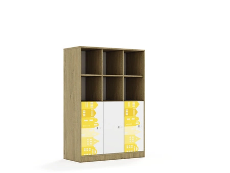 Kolekcja mebli przedszkolnych Houses to wyjątkowe rozwiązanie, które łączy funkcjonalność z estetyką, idealne dla przestrzeni edukacyjnych dla najmłodszych. Fronty szafek i szuflad są w kolorze białym, ozdobione drukowanymi motywami domków, które wprowadzają ciepły i przyjazny nastrój. Nadruki dostępne są w kolorach fioletowym, niebieskim, żółtym i pomarańczowym, dodając wnętrzom żywych i radosnych akcentów. Korpus posiadający uniwersalne owiercenia umożliwiające zamontowanie półek na różnych wysokościach. Cokół w kolorze korpusu chroniący dolne krawędzie mebla przed uszkodzeniami i zabrudzeniami. Półki w kolorze korpusu wykonane z płyty melaminowanej o grubości 18 mm. Mocowanie półek za pomocą złącz RAFIX firmy Hafele. Montaż polegajacy na wsunięciu półki z góry w dół, podobnie jak przy tradycyjnych podpórkach. Wbudowany mechanizm mimośrodu dociągający półkę, zapewniający wysoką stabilność mebla. Stopki regulujące umożliwiające wypoziomowanie mebla. Stopki antypoślizgowe zabezpieczające podłogę przed zarysowaniem. Ściany tylne mebla wykonane z białej płyty HDF o grubości 3mm. Wpuszczane w nutę wykonaną w bokach oraz wieńcu górnym co nadaje stabilności meblom oraz sprawia, że wszelkie połączenia płyty hdf z meblem są niewidoczne. Dodatkowo HDF usztywniony jest punktowymi, również niewidocznymi plastikowymi stabilizatorami wkręconymi i wciśniętymi między płytę a nutę. Przegroda w kolorze korpusu wykonana z płyty melaminowanej o grubości 18 mm.