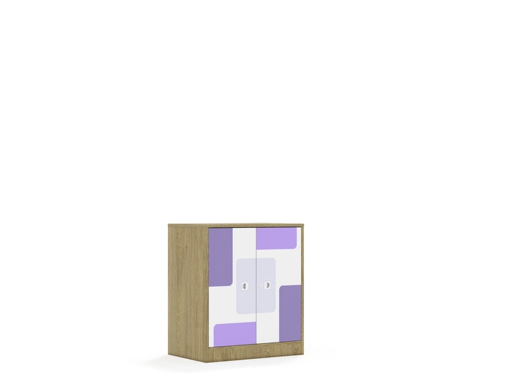 Nadruki dostępne są w kolorach fioletowym, niebieskim, żółtym, pomarańczowym i zielonym, co dodaje wnętrzom żywych, pastelowych akcentów i tworzy przyjazną atmosferę. Korpus posiadający uniwersalne owiercenia umożliwiające zamontowanie półek na różnych wysokościach. Cokół w kolorze korpusu chroniący dolne krawędzie mebla przed uszkodzeniami i zabrudzeniami. Półki w kolorze korpusu wykonane z płyty melaminowanej o grubości 18 mm. Mocowanie półek za pomocą złącz RAFIX firmy Hafele. Montaż polegajacy na wsunięciu półki z góry w dół, podobnie jak przy tradycyjnych podpórkach. Wbudowany mechanizm mimośrodu dociągający półkę, zapewniający wysoką stabilność mebla. Stopki regulujące umożliwiające wypoziomowanie mebla. Stopki antypoślizgowe zabezpieczające podłogę przed zarysowaniem. Ściany tylne mebla wykonane z białej płyty HDF o grubości 3mm. Wpuszczane w nutę wykonaną w bokach oraz wieńcu górnym co nadaje stabilności meblom oraz sprawia, że wszelkie połączenia płyty hdf z meblem są niewidoczne. Dodatkowo HDF usztywniony jest punktowymi, również niewidocznymi plastikowymi stabilizatorami wkręconymi i wciśniętymi między płytę a nutę. Przegroda w kolorze korpusu wykonana z płyty melaminowanej o grubości 18 mm.