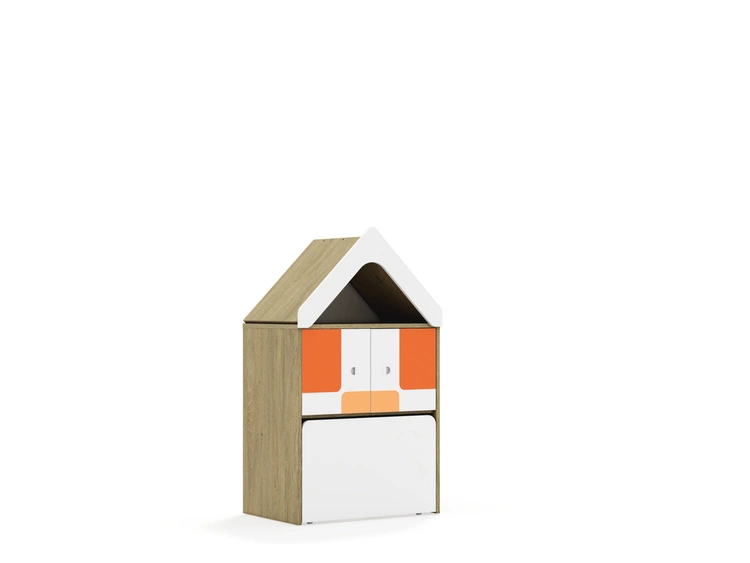 Nadruki dostępne są w kolorach fioletowym, niebieskim, żółtym, pomarańczowym i zielonym, co dodaje wnętrzom żywych, pastelowych akcentów i tworzy przyjazną atmosferę. Korpus posiadający uniwersalne owiercenia umożliwiające zamontowanie półek na różnych wysokościach. Cokół w kolorze korpusu chroniący dolne krawędzie mebla przed uszkodzeniami i zabrudzeniami. Półki w kolorze korpusu wykonane z płyty melaminowanej o grubości 18 mm. Mocowanie półek za pomocą złącz RAFIX firmy Hafele. Montaż polegajacy na wsunięciu półki z góry w dół, podobnie jak przy tradycyjnych podpórkach. Wbudowany mechanizm mimośrodu dociągający półkę, zapewniający wysoką stabilność mebla. Stopki regulujące umożliwiające wypoziomowanie mebla. Stopki antypoślizgowe zabezpieczające podłogę przed zarysowaniem. Ściany tylne mebla wykonane z białej płyty HDF o grubości 3mm. Wpuszczane w nutę wykonaną w bokach oraz wieńcu górnym co nadaje stabilności meblom oraz sprawia, że wszelkie połączenia płyty hdf z meblem są niewidoczne. Dodatkowo HDF usztywniony jest punktowymi, również niewidocznymi plastikowymi stabilizatorami wkręconymi i wciśniętymi między płytę a nutę. Przegroda w kolorze korpusu wykonana z płyty melaminowanej o grubości 18 mm.