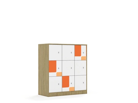 Kolekcja mebli przedszkolnych Pastel to nowoczesne i funkcjonalne rozwiązanie, stworzone z myślą o najmłodszych. Fronty szafek i szuflad są w kolorze białym i ozdobione drukowanymi motywami prostokątów i kwadratów w różnych ustawieniach.