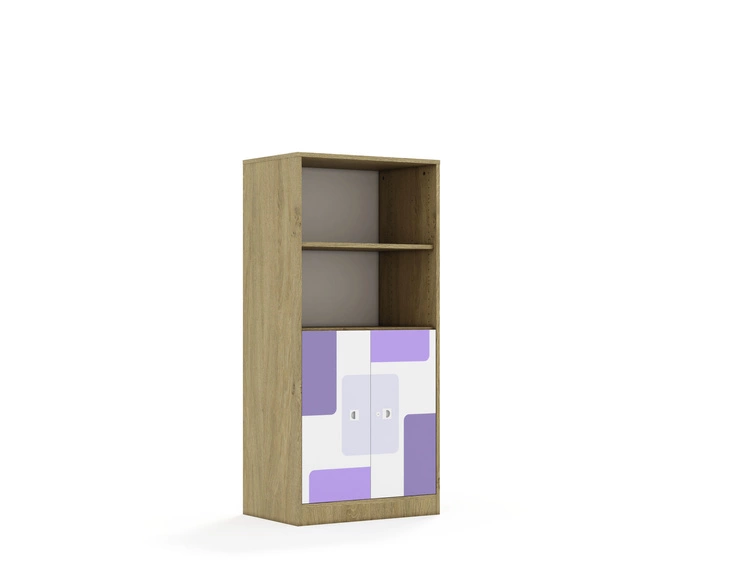 Nadruki dostępne są w kolorach fioletowym, niebieskim, żółtym, pomarańczowym i zielonym, co dodaje wnętrzom żywych, pastelowych akcentów i tworzy przyjazną atmosferę. Korpus posiadający uniwersalne owiercenia umożliwiające zamontowanie półek na różnych wysokościach. Cokół w kolorze korpusu chroniący dolne krawędzie mebla przed uszkodzeniami i zabrudzeniami. Półki w kolorze korpusu wykonane z płyty melaminowanej o grubości 18 mm. Mocowanie półek za pomocą złącz RAFIX firmy Hafele. Montaż polegajacy na wsunięciu półki z góry w dół, podobnie jak przy tradycyjnych podpórkach. Wbudowany mechanizm mimośrodu dociągający półkę, zapewniający wysoką stabilność mebla. Stopki regulujące umożliwiające wypoziomowanie mebla. Stopki antypoślizgowe zabezpieczające podłogę przed zarysowaniem. Ściany tylne mebla wykonane z białej płyty HDF o grubości 3mm. Wpuszczane w nutę wykonaną w bokach oraz wieńcu górnym co nadaje stabilności meblom oraz sprawia, że wszelkie połączenia płyty hdf z meblem są niewidoczne. Dodatkowo HDF usztywniony jest punktowymi, również niewidocznymi plastikowymi stabilizatorami wkręconymi i wciśniętymi między płytę a nutę.