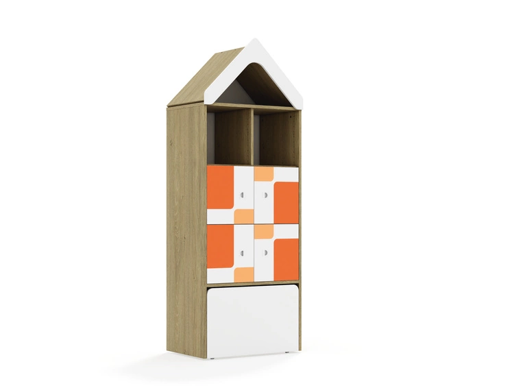 Kolekcja mebli przedszkolnych Pastel to nowoczesne i funkcjonalne rozwiązanie, stworzone z myślą o najmłodszych. Fronty szafek i szuflad są w kolorze białym i ozdobione drukowanymi motywami prostokątów i kwadratów w różnych ustawieniach.