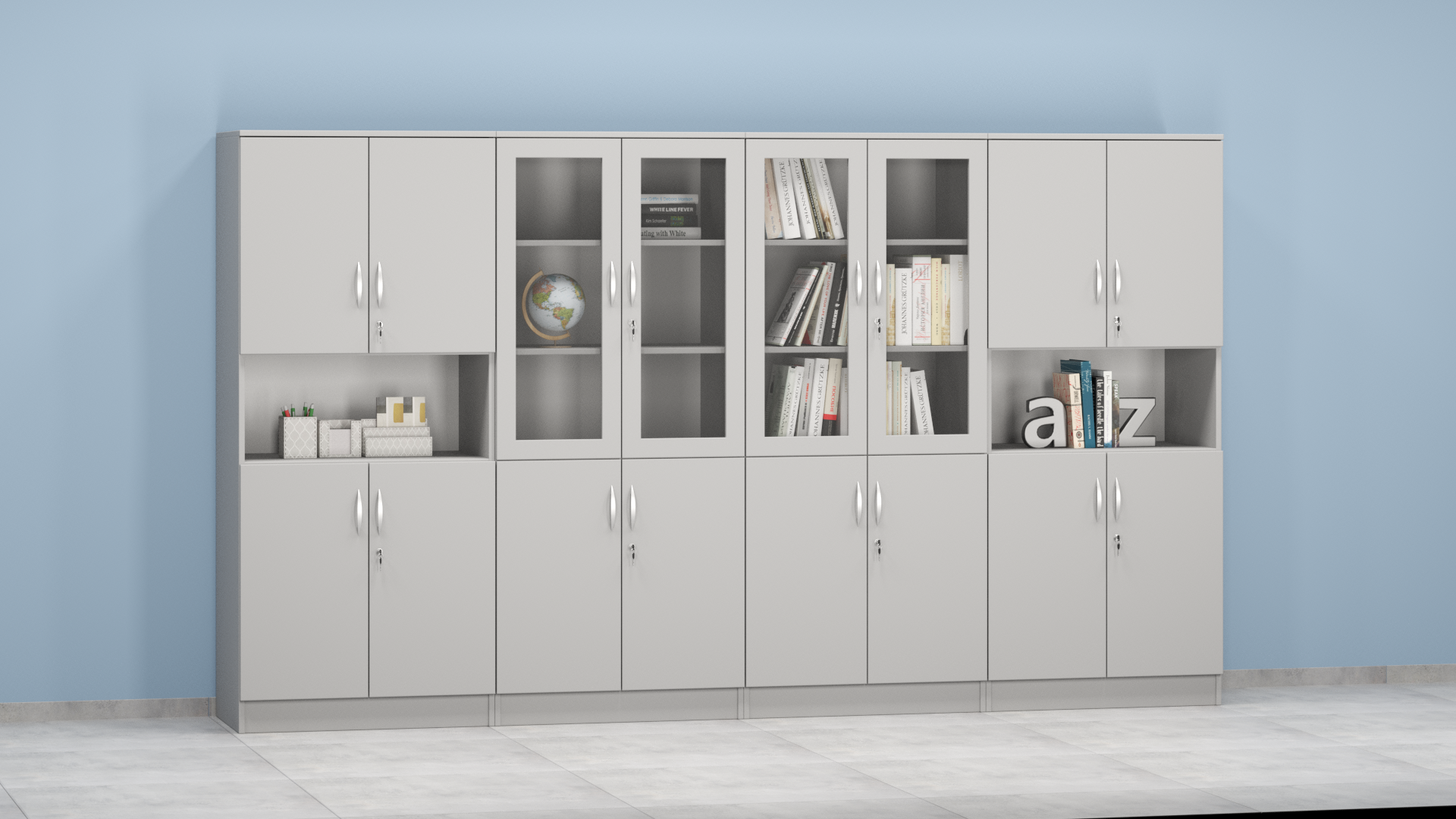 Zestaw zawiera 4 głębokie, zamykane na zamek szafy: