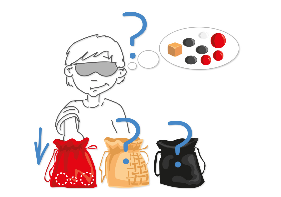 Woreczki i drewniane korale do rozpoznawania i porównywania zawartości, kształtu, wielkości, i ciężaru na ślepo.