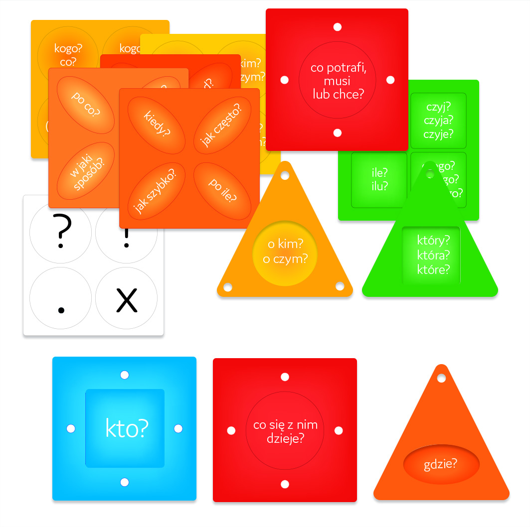 Karty do układania opowieści, kości do losowania kolorów kart i osób gramatycznych i rodzajów i trybów zdań.