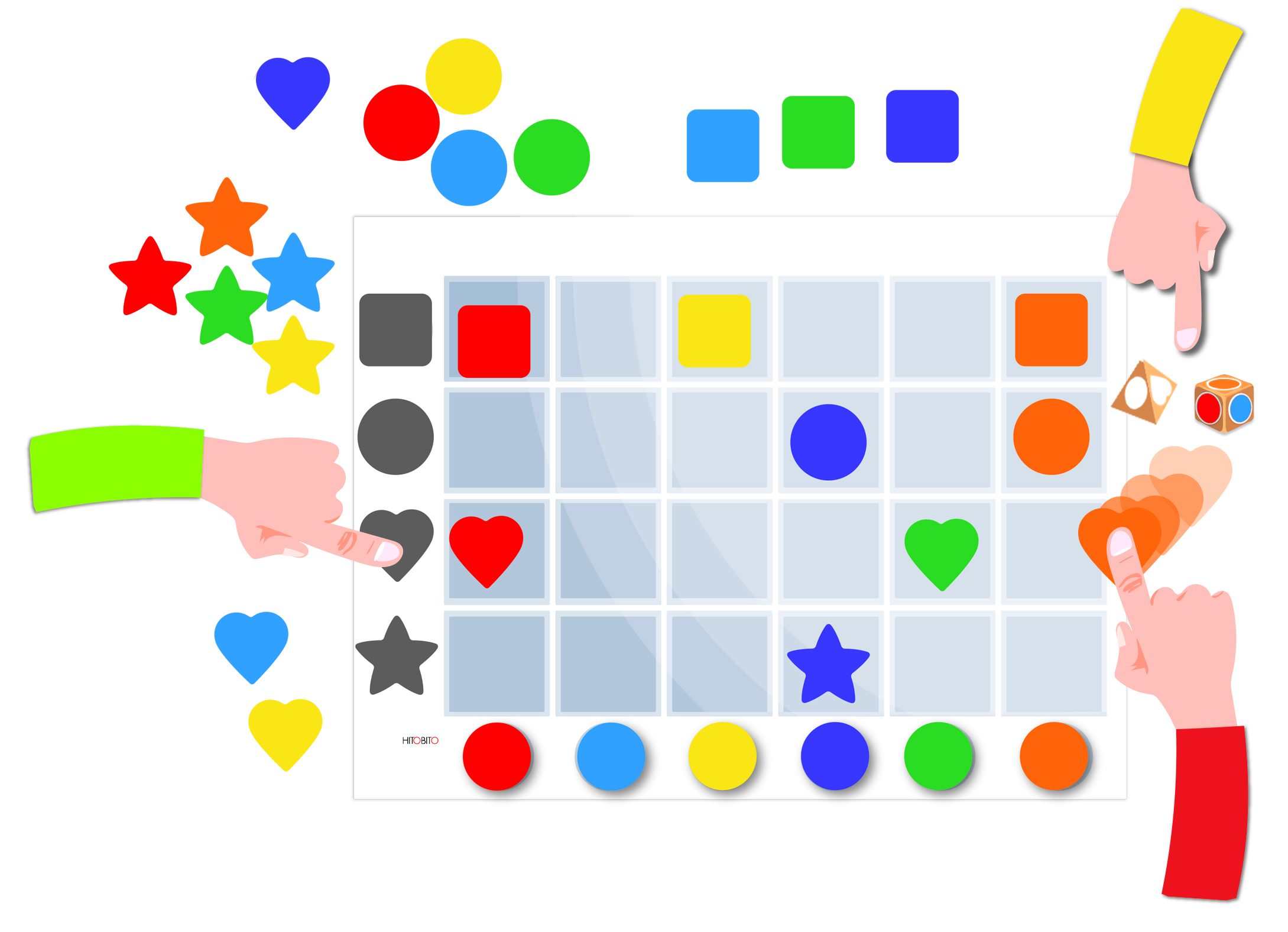 Duże kartonowe kształty: koła, kwadraty, serca, gwiazdy, strzałki; znaki matematyczne, cyfry, zbiory oraz pasująca do nich plansza.