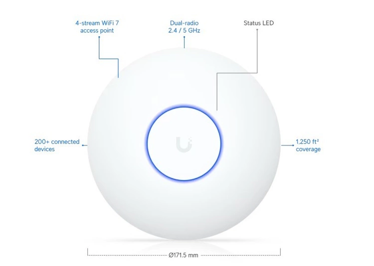 - Kompaktowy, montowany na suficie punkt dostępu WiFi 7 z 4 strumieniami przestrzennymi i łączem uplink 2,5 GbE.