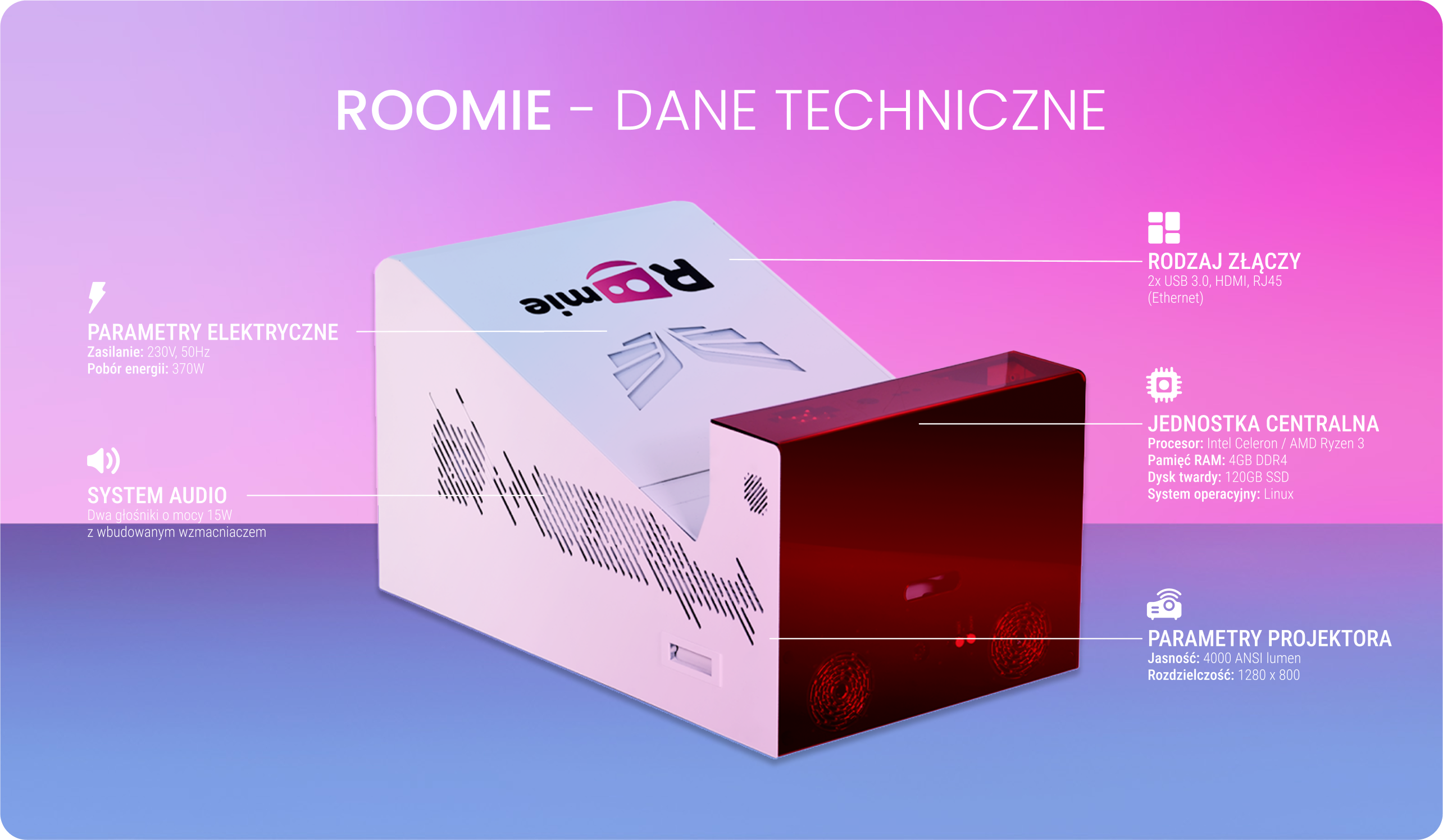 Roomie to produkt multimedialny pozwalający na wszechstronną naukę, terapię i zabawę użytkownikom w każdym wieku. To kreatywne i innowacyjne rozwiązanie, które uczy poprzez zabawę. Dzięki szerokiej gamie zastosowań edukacyjnych jest doskonałym narzędziem edukacyjnym. Lekcje są nie tylko ciekawsze, ale także wypełnione po brzegi merytoryczną treścią. A wszystko to zamknięte w zgrabnej obudowie, która zapewnia pełną mobilność urządzenia pomiędzy salami wykładowymi, salami konferencyjnymi czy biurami.