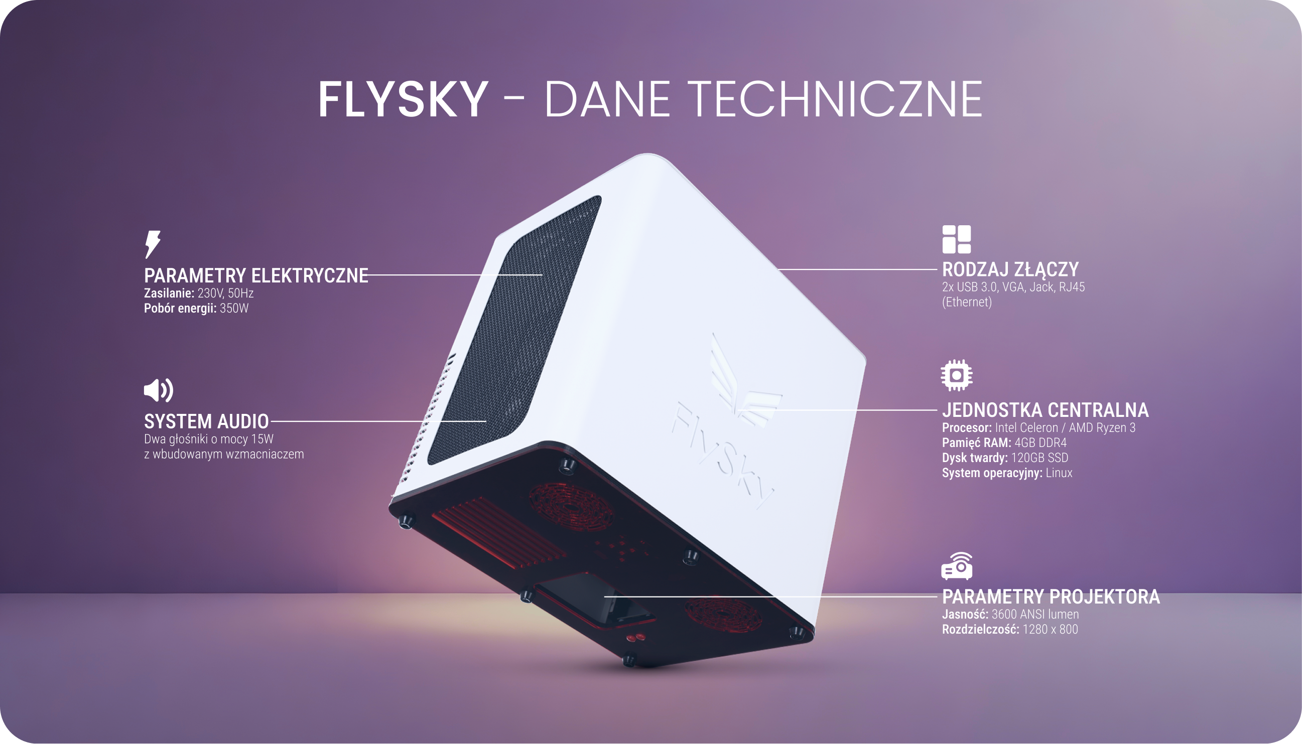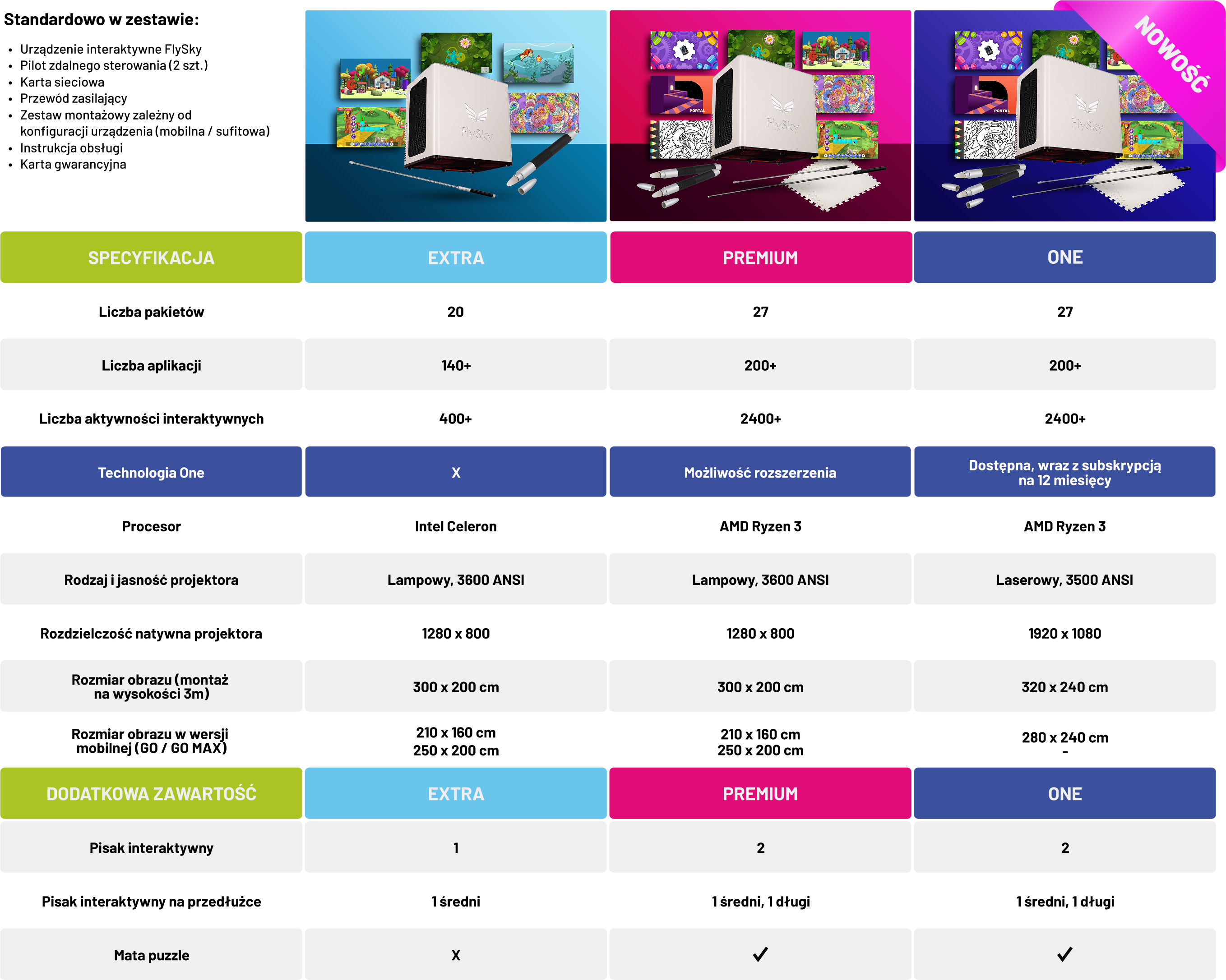 W urządzeniach z serii One (FlySky One) technologia One jest wbudowana. Urządzenie interaktywne jest od razu dostarczane w zestawie z tabletem Samsung. Można z niej korzystać od razu po uruchomieniu urządzenia.
