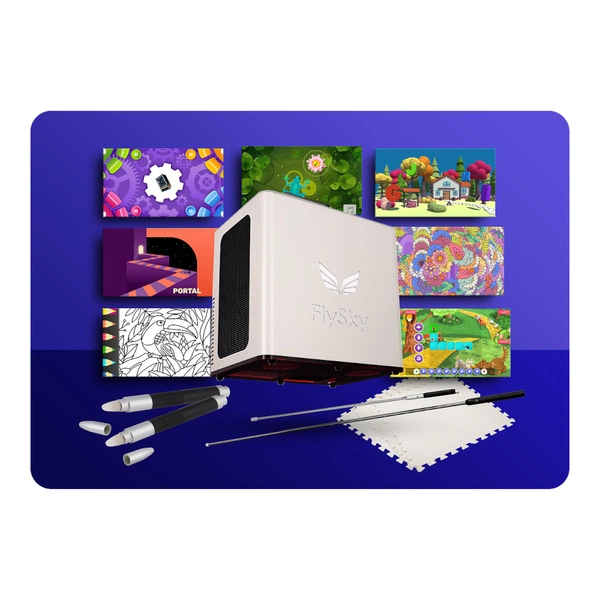 Podłoga interaktywna FlySky to produkt multimedialny pozwalający na wszechstronną naukę, terapię i zabawę użytkownikom w każdym wieku. Jest kreatywnym i innowacyjnym rozwiązaniem, które uczy przez zabawę. Jego integralną częścią jest projektor krótkoogniskowy, jednostka obliczeniowa oraz kamera wraz z dedykowanym oprogramowaniem. Za pomocą umieszczonego wewnątrz rzutnika, na podłogę wyświetlany jest obraz, który aktywują poruszający się po nim użytkownicy. Aktywny obszar doświetlany jest przez umieszczone w dolnym panelu diody LED emitujące światło w paśmie podczerwonym. W efekcie, przemieszczania się lub wykonywania gestów, wyzwalana jest zmiana obrazu, co pozwala na obsługę szerokiego spektrum gier, aplikacji oraz stron internetowych.