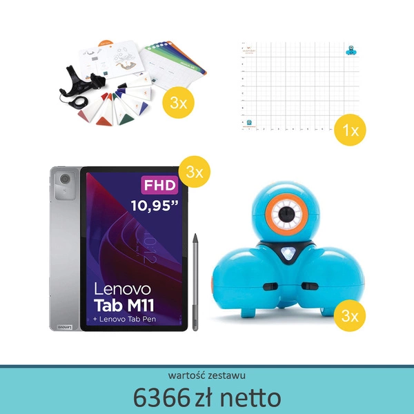 Zestaw wprowadzający dzieci w świat programowania i zawierający wartościowe pomoce dla nauczycieli pracujących w przedszkolu. Należą do niego: roboty edukacyjne DASH, akcesoria do robotów w postaci zestawu do rysowania, biała mata do robotów, tablety Lenovo Tab M11 TB330FU 10.95″ 8/128GB Wi-Fi Luna Grey z rysikami. Dzięki tym narzędziom mali uczestnicy zajęć rozwijają swoje umiejętności z zakresu logicznego myślenia, rozwiązywania problemów, współpracy i podstaw języka angielskiego.