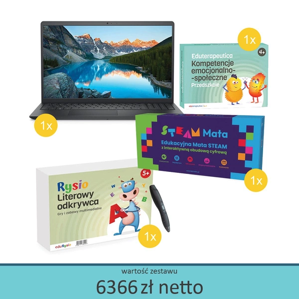 Zestaw sprawdzający się podczas zajęć wprowadzających dzieci w świat technologii i informatyki oraz kształtujących kompetencje przyszłości. Zawiera: Edukacyjną MATĘ STEAM z interaktywną obudową cyfrową, Notebook Dell Vostro 3530, program multimedialny Kompetencje emocjonalno-społeczne. Przedszkole, pakiet multimedialny Rysio Literkowy odkrywca z długopisami 3D Banach Junior 9w1. Dzięki temu zestawowi nauka, współpraca i rozwój umiejętności łączą się z dobrą zabawą.