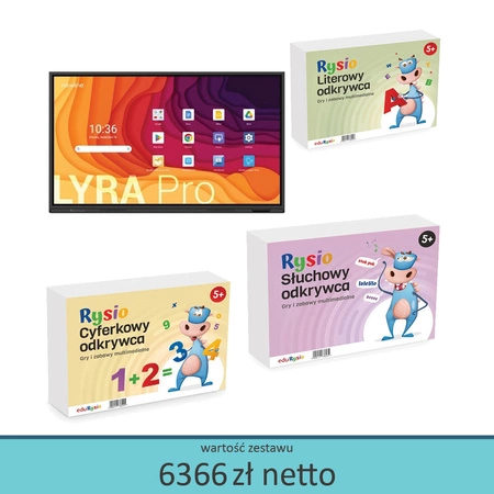 Zestaw sprawdzający się podczas przedszkolnych zajęć, na których dzieci przygotowują się do nadchodzących szkolnych wyzwań i zapoznają się z nowoczesnymi technologiami. W jego skład wchodzą: Monitor Interaktywny Newline LYRA PRO TT-6523QA oraz pakiety multimedialne: Rysio Literkowy Odkrywca, Rysio Cyferkowy Odkrywca, Rysio Słuchowy Odkrywca. Dzięki nim nauka liter, cyfr i rozpoznawania dźwięków staje się dobrą zabawą.