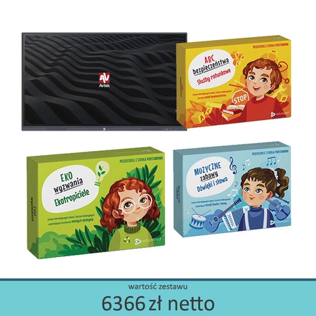 Zestaw przeznaczony do pracy z przedszkolakami, pomagający w zaplanowaniu i przeprowadzaniu jeszcze bardziej angażujących, efektywnych zajęć. Zawiera: Monitor interaktywny Avtek TS 8 Mate 75 oraz interaktywne zestawy: EKOwyzwania. Ekotropiciele, Muzyczne zabawy. Dźwięki i słowa, ABC Bezpieczeństwa. Służby ratunkowe. Interaktywne zestawy są dostosowane do pracy z dziećmi o specjalnych potrzebach edukacyjnych (SPE).