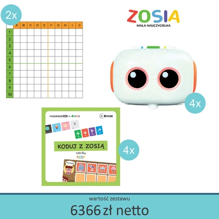 Zestaw pomagający wspierać wszechstronny rozwój dzieci. Zawiera: interaktywne roboty edukacyjne Zosia Mała Nauczycielka, plansze interaktywne Koduj z Zosią oraz duże Maty do kodowania. Dzięki temu zestawowi dzieci przygotowują się do nadchodzących szkolnych wyzwań w angażujący sposób oraz w praktyce poznają podstawy kodowania.