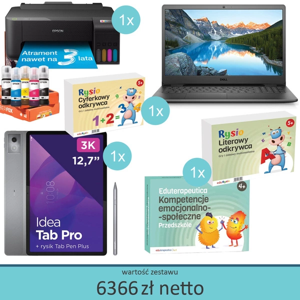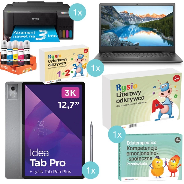 Zestaw przeznaczony do pracy w środowisku przedszkolnym. Zawiera: Laptop Dell Inspiron 15, Drukarkę Atramentową EPSON EcoTank L1230, pakiety mutimedialne: Rysio Cyferkowy Odkrywca i Rysio Literkowy Odkrywca, multimedialny program dla przedszkolaków Cyber Fox, pakiet Eduterapeutica Lux. Kompetencje emocjonalno-społeczne. Przedszkole oraz Tablet Lenovo IdeaTab Pro. Dzięki temu zestawowi nauka i przygotowanie do nadchodzących szkolnych wyzwań łączą się z multimedialnymi aktywnościami i dobrą zabawą.