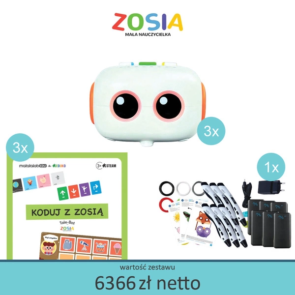 Zestaw pomagający wspierać wszechstronny rozwój dzieci. Zawiera: interaktywne roboty edukacyjne Zosia Mała Nauczycielka, plansze interaktywne Koduj z Zosią oraz Zestaw edukacyjny 6 długopisów 3D z zapasem filamentu i powerbankami. Dzięki temu zestawowi dzieci przygotowują się do nadchodzących szkolnych wyzwań w angażujący sposób oraz poznają nowoczesne technologie.