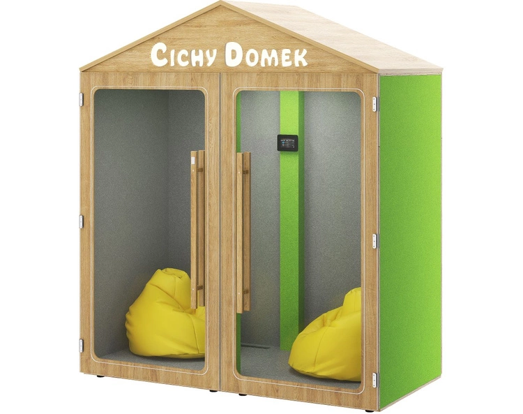 - Kabina akustyczna dla dzieci w wieku szkolnym. Pełni funkcję pokoju wyciszenia. Ten wariant Cichego Domku jest wyposażony w relaksacyjne pufy.