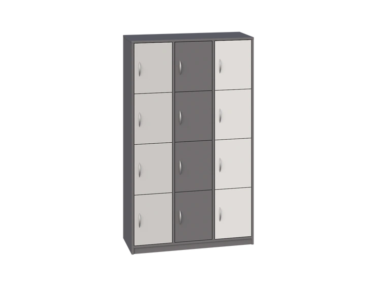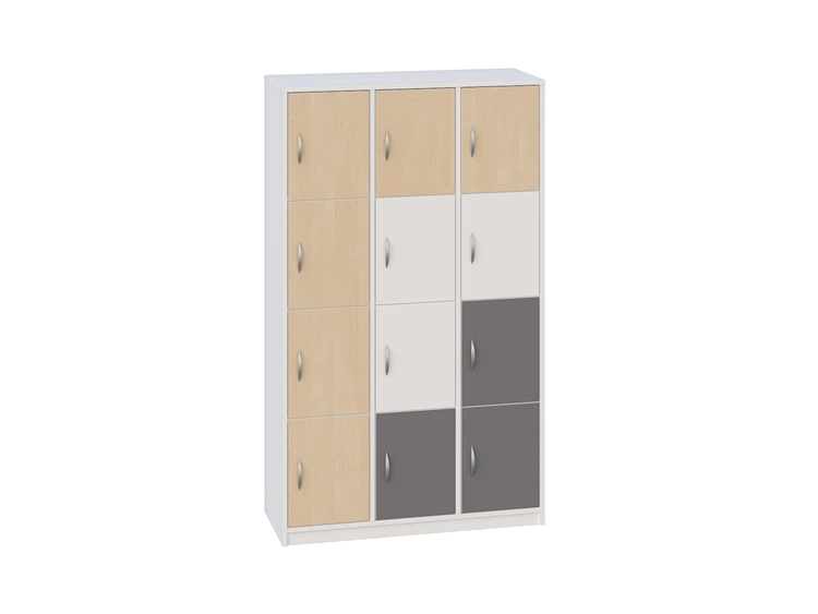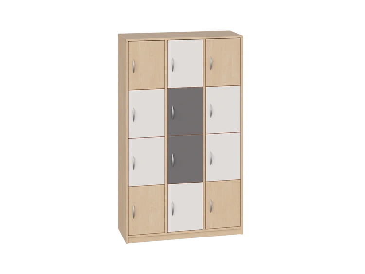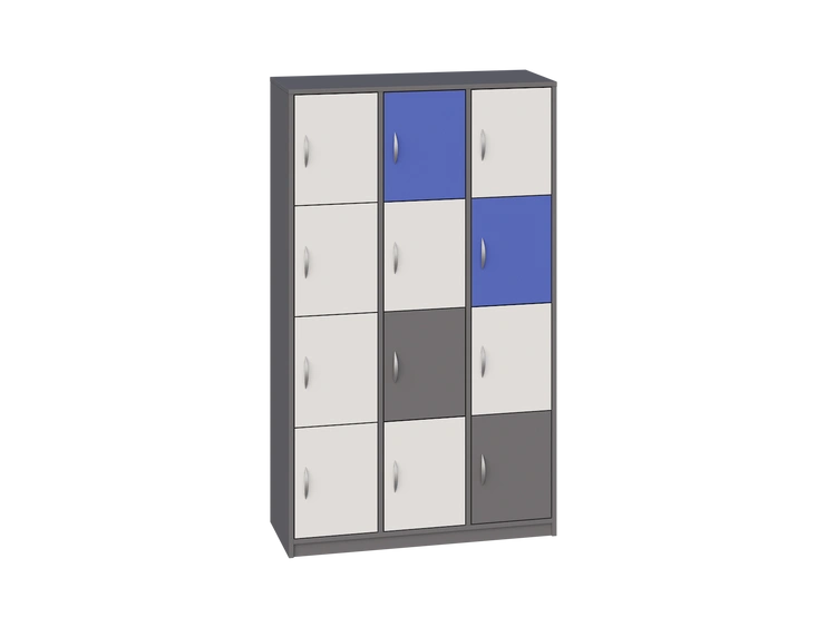 - Posiada 2 przegrody i 9 półek, które tworzą 12 schowków do przechowywania, zamykane drzwiczkami bez zamka.