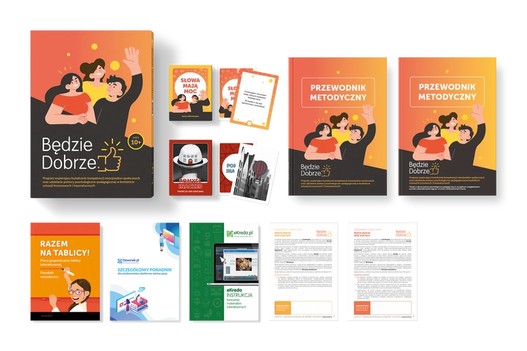 Będzie Dobrze to setki interaktywnych ekranów i interaktywnych plansz, dwa obszerne podręczniki metodyczne, dwa autorskie zestawy kart do gier, zabaw i ćwiczeń (zestaw kart Pomyśl inaczej & Słowa mają moc), karty pracy i szczegółowe scenariusze zajęć. Program dostępny jest na zasadzie bezterminowej licencji dla dziewięciu nauczycieli i 30 uczniów.