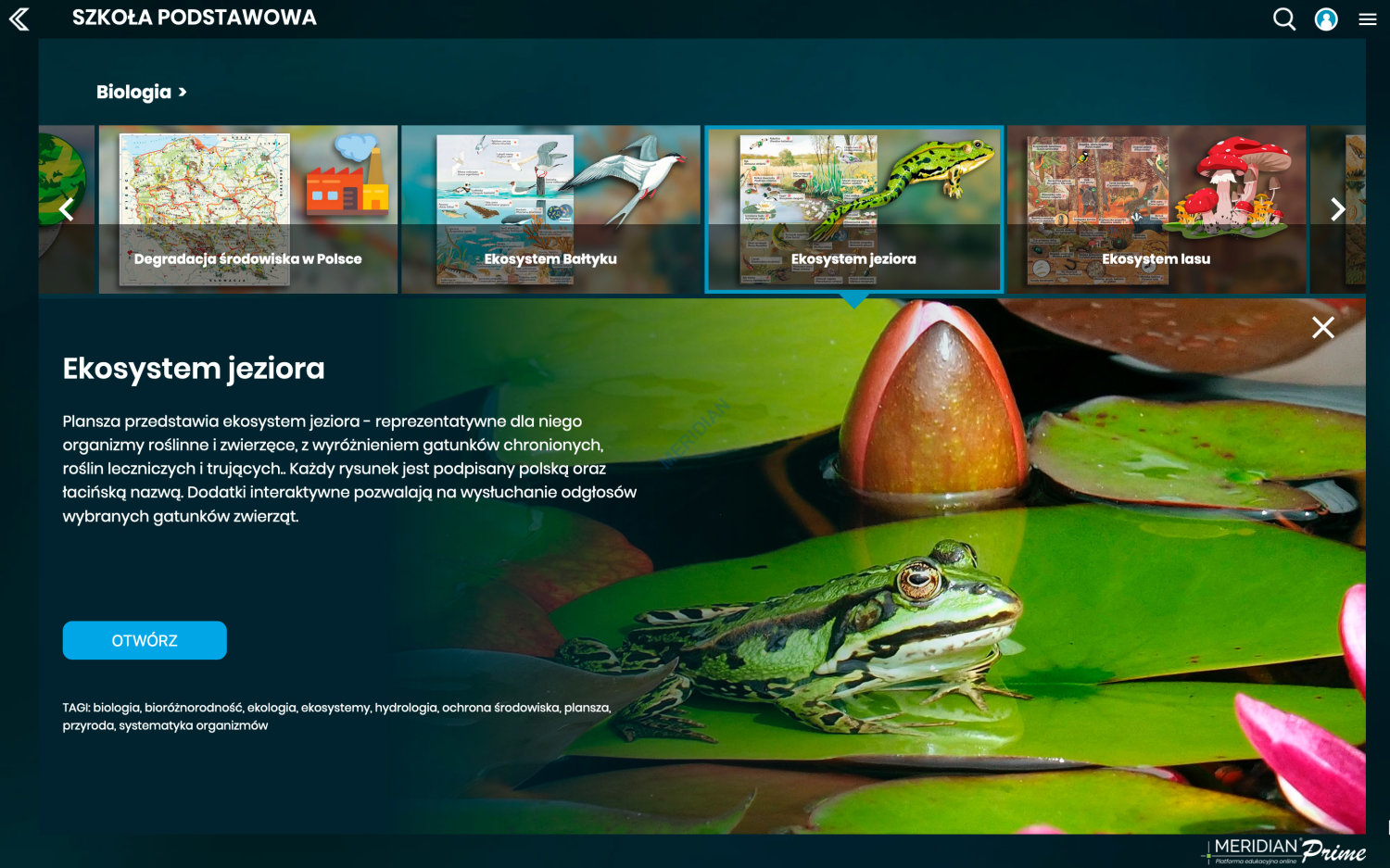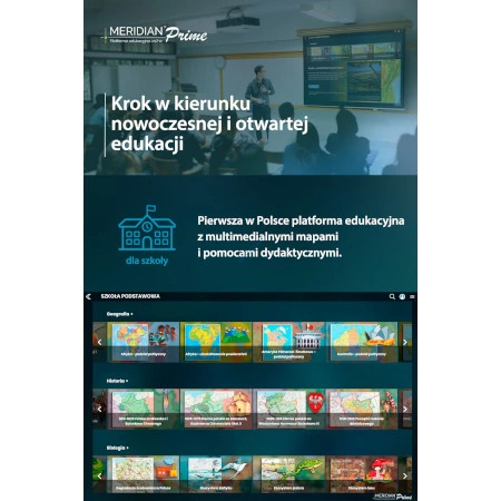 Platforma Meridian Prime to wygodne i doskonałe narzędzie dla nauczycieli i uczniów szkół każdego typu i poziomu nauczania. Zawiera obecnie ponad 170 map do geografii, historii, ekologii, przyrody, biologii, WOS-u, matematyki i wielu innych.
